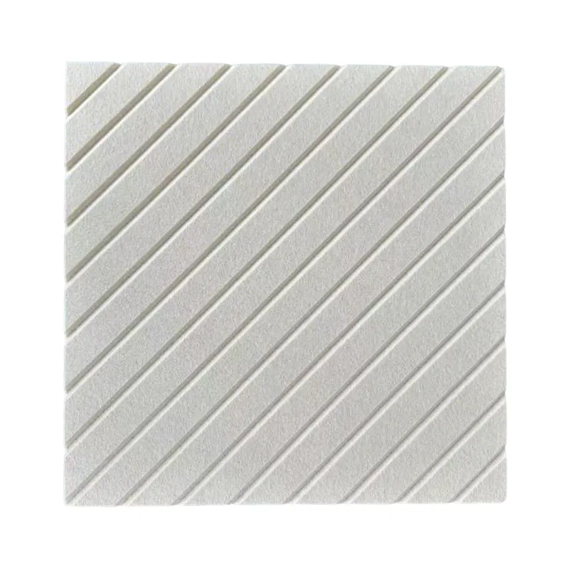 आमचे उच्च-गुणवत्तेचे बेज व्ही-कट पीईटी फील अकौस्टिक पॅनल्स 100% पॉलिस्टर फायबर बेस मटेरियल म्हणून वापरतात, पृष्ठभागावर नाजूक व्ही-कट टेक्सचरसह, स्पर्शास मऊ आणि आरामदायक वाटते. आतील भाग सूक्ष्म सूक्ष्म छिद्रांनी भरलेले आहे जे प्रभाव पडल्यावर आवाज प्रभावीपणे पकडतात, प्रतिबिंब आणि पुनरावृत्ती रोखतात. हे केवळ इको नॉइजच सोडवत नाही तर भिंतीचे सौंदर्यशास्त्र त्याच्या अष्टपैलू बेज रंगाने वाढवते, आवाज कमी करणे तुमच्या सजावटीच्या शैलीशी विरोधाभास होणार नाही याची खात्री करून - व्यावहारिक आणि सुंदर!